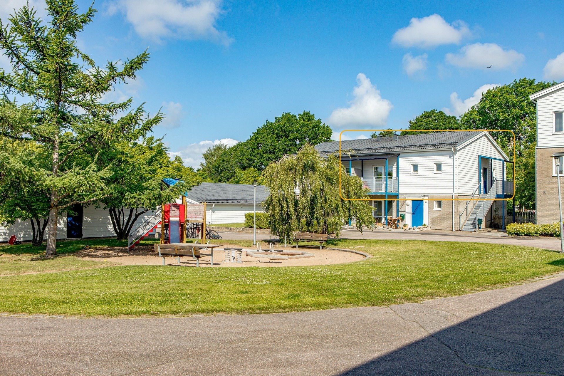 Här bor du i ett centralt läge med närhet till allt – butiker, restauranger, skolor och kommunikationer. För den som gillar hav och natur ligger Skrea strand endast tio minuter bort med cykel, vilket gör läget perfekt både för vardagsliv och fritid.
