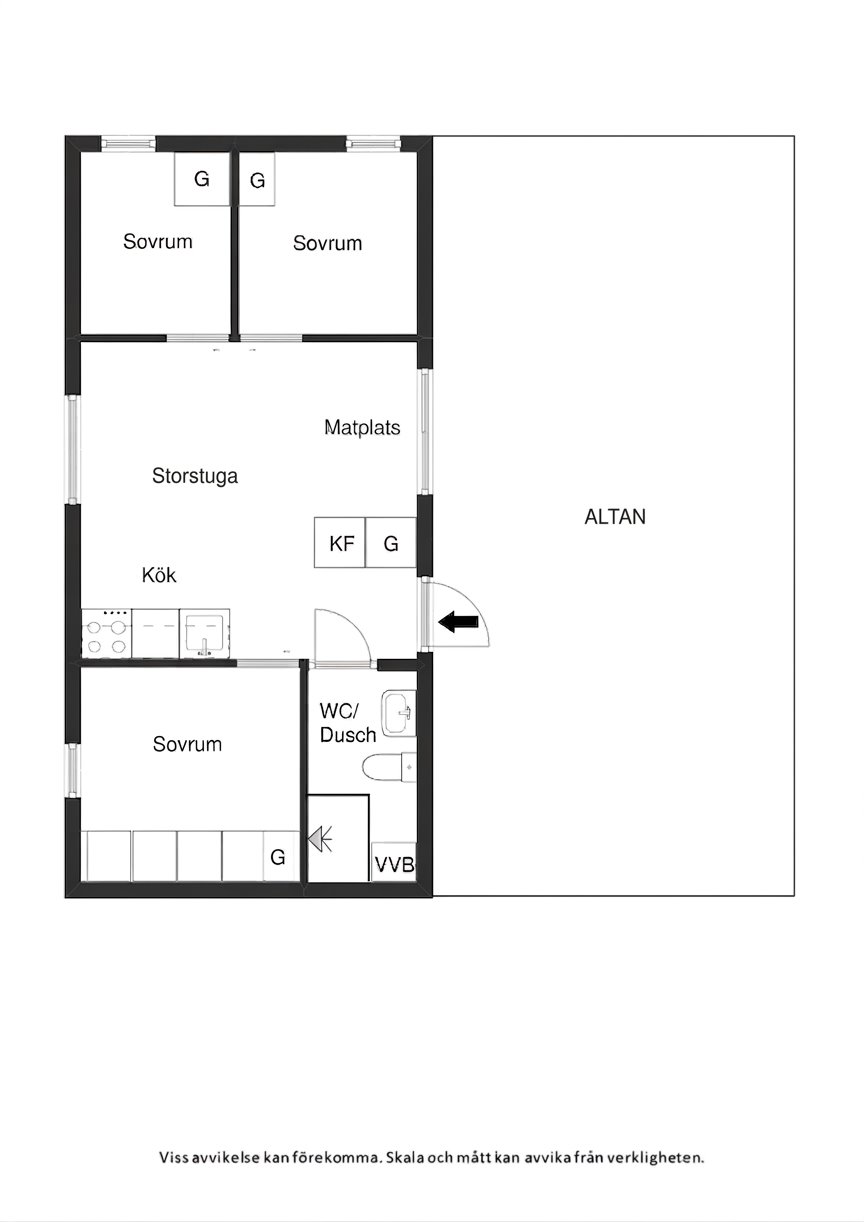 Planlösningen rymmer tre separata sovrum, ett trivsamt allrum med kök och matplats samt ett badrum med golvvärme och möjlighet till tvättmaskin. Här har varje kvadratmeter utnyttjats för att skapa ett funktionellt och inbjudande hem.