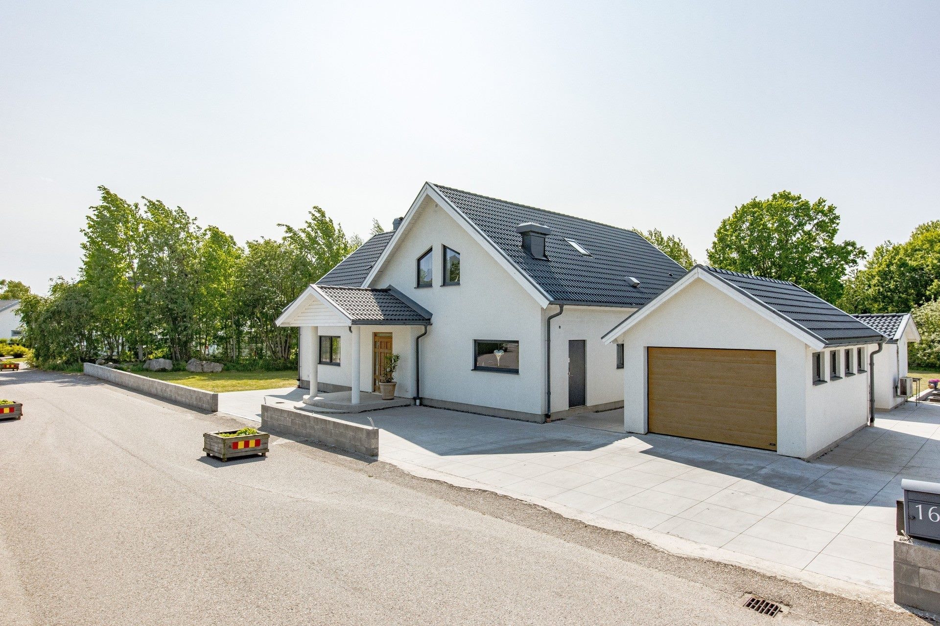 I Stafsinge presenterar vi nu ett gedigen och nyare (2016) villa om hela 270kvm fördelat på 8 rum och kök, tre badrum samt en privat takterass med naturskön vy. Villan byggd i lättbetong har putsad fasad i vitt ihop med stilrena fönster med mörkgrå karm.